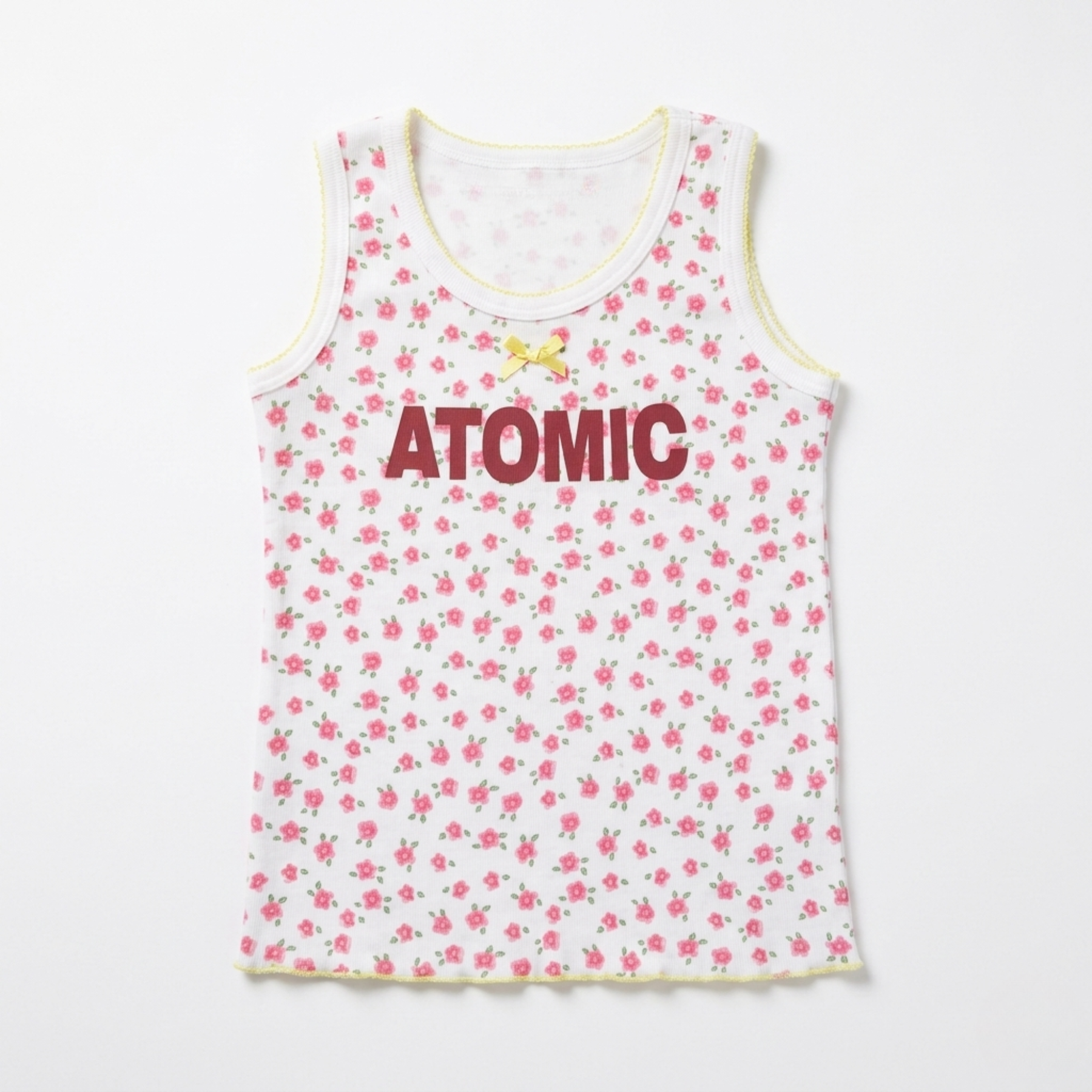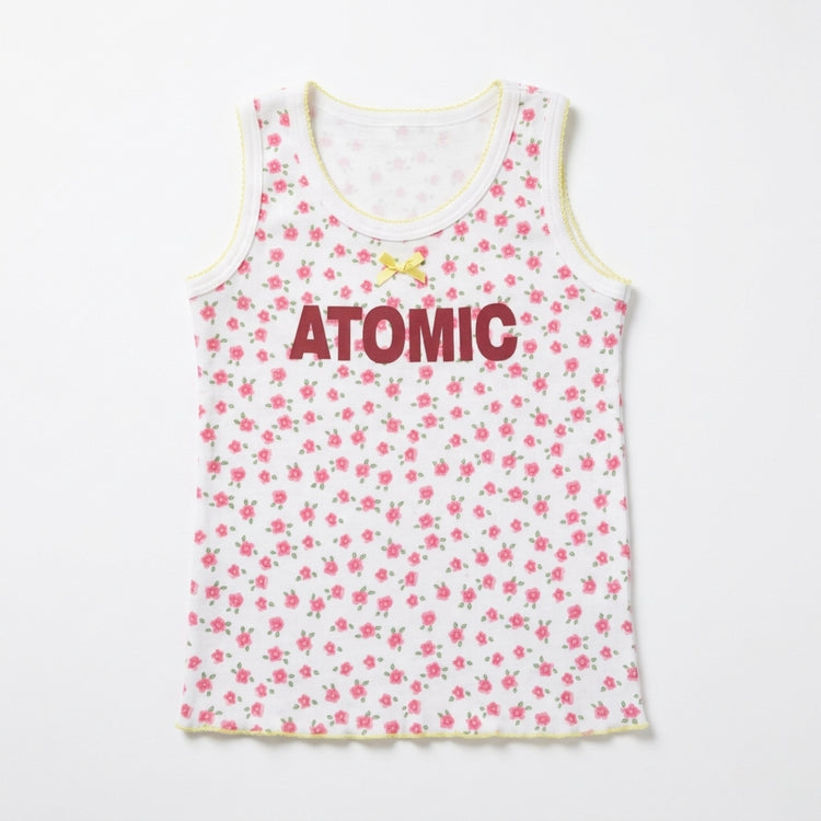 Retro Graphic Print: Features the bold "ATOMIC" text in a deep crimson hue, providing a striking contrast to the delicate floral pattern.