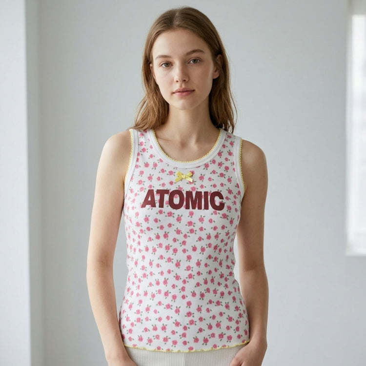 Elevate your casual wardrobe with a touch of vintage charm. The ATOMIC Retro Floral Ribbed Tank Top perfectly blends soft, feminine aesthetics with a bold statement. Adorned with an all-over pink rosebud print and a dainty yellow bow, this top is the ultimate piece for summer lounging or creating an effortless Y2K-inspired look.