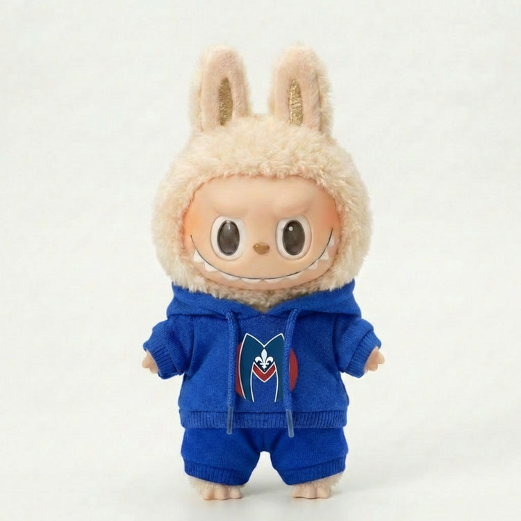 Give your collectible a cozy, street-ready makeover with the Labubu Hollander Hoodie and Pants Set. This outfit features a thick blue pullover hoodie complete with functional drawstrings and the iconic winged "M" crest on the chest. Paired with matching blue pants, it creates a warm and stylish athletic look perfect for the season.