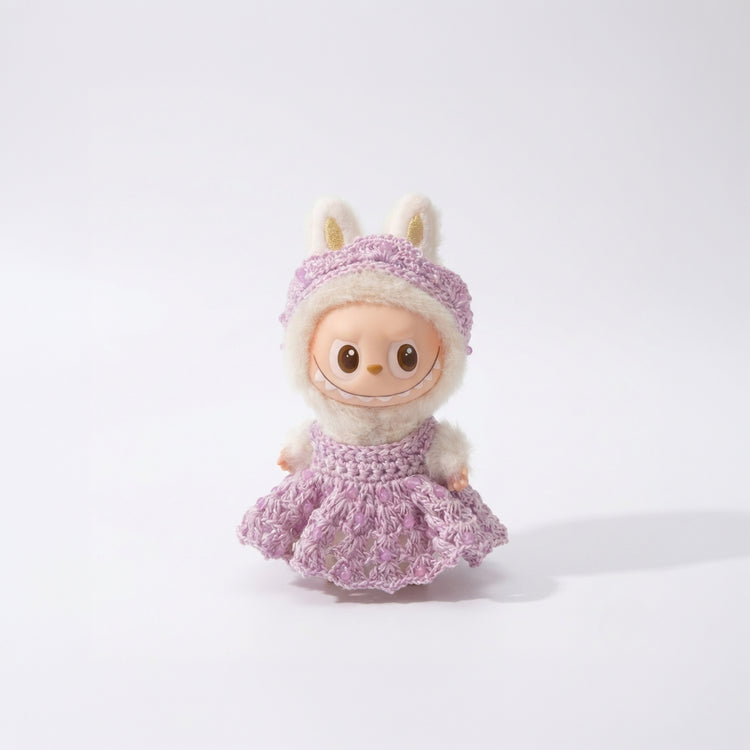 Elevate your Labubu "Pin For Love" (V4) figure's style with this exquisite Elegant Crochet Dress & Crown Set. Available in three stunning colors—soft Pink, striking Black with gold accents, and a delicate beaded Purple—this premium handcrafted-style outfit features a beautifully textured crocheted dress with a regal, flared skirt. Paired with a matching woven crown, it is the perfect regal upgrade for your plush companion.